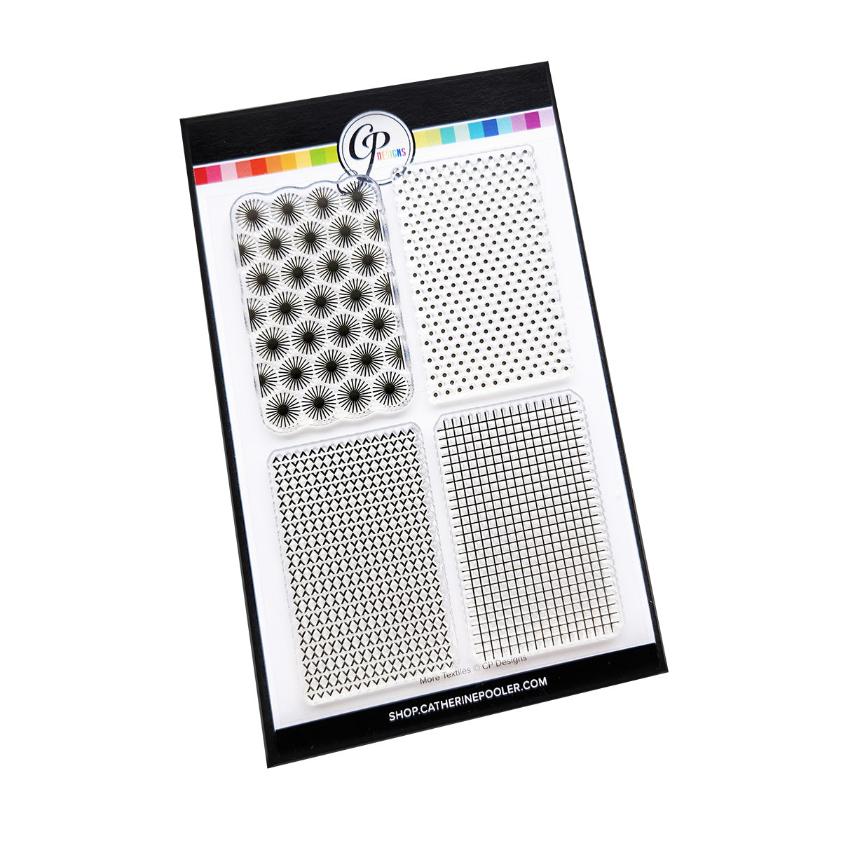 Add texture and pattern to your projects and die cut images with this versatile stamp set. Four blocks feature different designs—sunburst, polka dots, grid, and chevron—perfect for layering, embossing, or adding a unique touch.